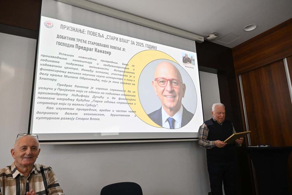 Оснивач и председник ИИЦ „Стари Влах“, Милорад Мишко Стевовић уручио је Старовлашку Повељу Предрагу Каназиру, успешном војвођанском привреднику.