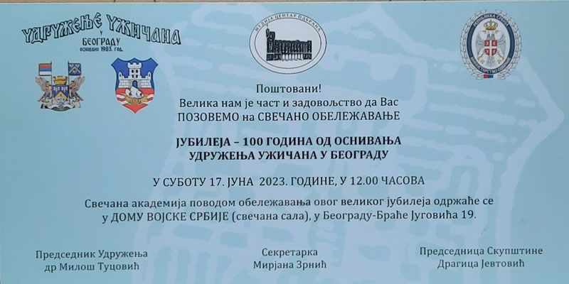 На позив Удружења Ужичана у Београду, у суботу 17. јуна 2023. године, присуствовали смо обелезавању нестварног јубилеја 100 година од оснивања Удружења Ужичана у Београду.